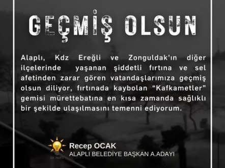 Alaplı, Kdz Ereğli ve Zonguldak’ın diğer ilçelerinde yaşanan şiddetli fırtına ve sel afetinden zarar gören vatandaşlarımıza geçmiş olsun diliyor, fırtınada kaybolan “Kafkametler” gemisi mürettebatına en kısa zamanda sağlıklı bir şekilde ulaşılmasını temenni ediyorum.