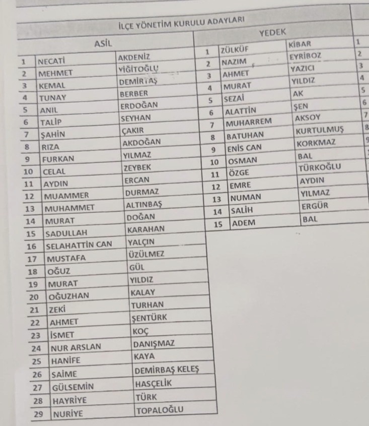 Necati Akdeniz, Mehmet Yiğitoğlu, Kemal Demirtaş, Tunay Berber, Anıl Erdoğan, Talip Seyhan, Şahin Çakır, Rıza Akdoğan, Furkan Yılmaz, Celal Zeybek, Aydın Ercan, Muhammet Durmaz, Muhammet Altınbaş, Murat Doğan, Sadullah Karahan, Selahattin Yalçın, Mustafa Üzülmez, Oğuz Gül, Murat Yıldız, Oğuzhan Kalay, Zeki Turhan, Ahmet Şentürk, İsmet Koç, Nur Arslan Danışmaz, Hanife Kaya, Saime Demirbaş Keleş, Gülsemin Hasçelik, Hayriye Türk, Nuriye Topaloğlu.