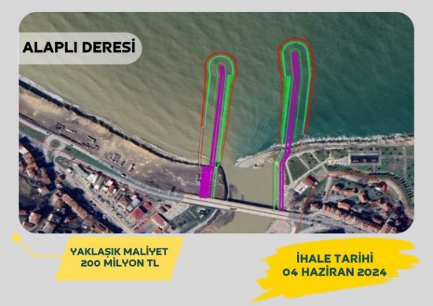Alaplı deresinin çıkışındaki sorunu ortadan kaldırmak için proje çalışmaları tamamlanmış olup, yaklaşık maliyeti 200 Milyon TL olan işin yapım ihalesi 04 Haziran 2024 tarihinde gerçekleştirilecektir”dedi.