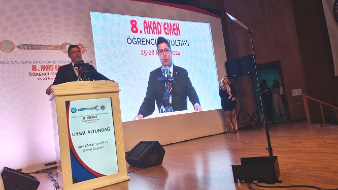 Altundağ: “Bu tür toplantılarda güçlenen sendikalı örgüt toplum bilincinin, geleceğimizi teminat altına alacağına da yürekten inanıyorum. Türk Metal Sendikası olarak Akademek Kurultayı toplantılarına o kadar büyük önem atfediyoruz ki, 24 Şubat’ta Rahmetli Onursal Genel Başkanımızın vefatı ile yaşadığımız büyük kayba ve o büyük acıya rağmen, artık bu toplantıyı ötelemeyi bir kez daha aklımızdan geçirmedik. Çünkü bizler, istisnasız her alanda bilimin öncülüğüne ve gençlerin geleceğimiz olduğuna inanmış bir fikrin etrafında birleşiyoruz. Çünkü biz Türk Metalliler, acılar ne kadar büyük olursa olsun, emek mücadelesinin hiç duraksamadan devam etmesi gerektiğine inanıyoruz.