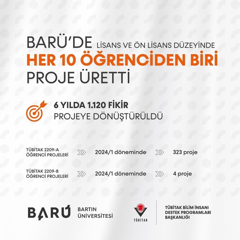 Nitelikli bilimsel araştırma ve teknolojik etki değeri yüksek çalışmalarıyla adından söz ettiren BARÜ’de “Proje Tabanlı Öğrenme” hedefiyle önemli çalışmalar yapılıyor. Bu doğrultuda TÜBİTAK 2209-A kapsamında; 2019/2 döneminde 32, 2020/1 döneminde 27, 2020/2 döneminde 58, 2021/1 döneminde 52, 2021/2 döneminde 133, 2022/1 döneminde 164, 2022/2 döneminde 69, 2023/1 döneminde 150 öğrenci projesi kabul edilen BARÜ’de 2023/2 döneminde 112 proje desteklenmişti. “Üreten Üniversite” anlayışıyla araştırma kültürünün bir pratiğe dönüştüğü BARÜ’de 2024/1 döneminde ise 323 proje desteklenmeye değer bulundu. Böylece BARÜ, TÜBİTAK 2209-A destekleme programı sonuçlarına göre Türkiye’nin en fazla öğrenci projesi üreten yükseköğretim kurumlarından biri oldu.