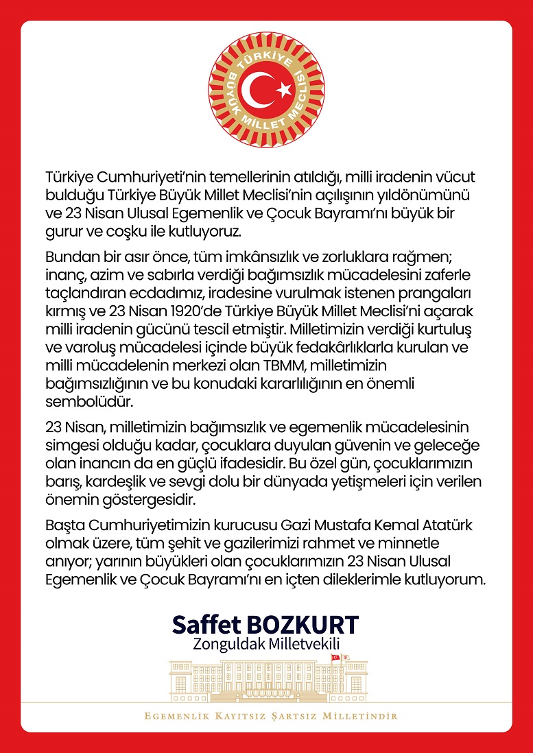 Bundan bir asır önce, tüm imkânsızlık ve zorluklara rağmen; inanç, azim ve sabırla verdiği bağımsızlık mücadelesini zaferle taçlandıran ecdadımız, iradesine vurulmak istenen prangaları kırmış ve 23 Nisan 1920’de Türkiye Büyük Millet Meclisi’ni açarak milli iradenin gücünü tescil etmiştir. Milletimizin verdiği kurtuluş ve varoluş mücadelesi içinde büyük fedakârlıklarla kurulan ve milli mücadelenin merkezi olan TBMM, milletimizin bağımsızlığının ve bu konudaki kararlılığının en önemli sembolüdür.