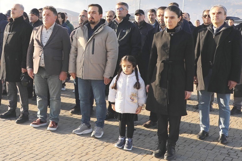 Çelenk sunumunun ardından Atatürk’ün hayata gözlerini yumduğu 09.05’te sirenlerin çalmasıyla 2 dakikalık saygı duruşunda bulunuldu. Ardından okunan İstiklal Marşı ile birlikte bayraklar yarıya indirildi.