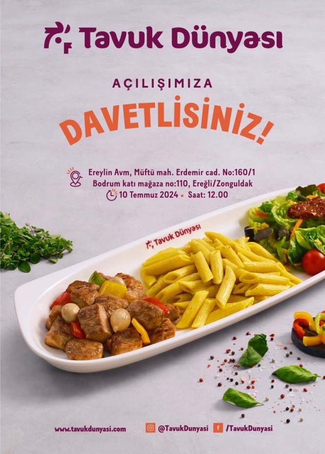 Kdz. Ereğli'nin ilk alışveriş merkezi Ereylin AVM bünyesine yeni markalar kazandırmaya devam ediyor. Tavuk Dünyası görkemli bir törenle ile 10 Temmuz 2024 Çarşamba Günü,Saat 12.00'de hizmete açılacaktır.