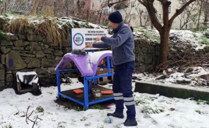 Kdz. Ereğli’de kar yağışı ve soğuk hava etkisini sürdürürken Belediye Veteriner İşleri Müdürlüğü sokaktaki canları unutmadı.