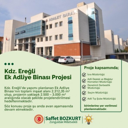 Kdz. Ereğli’de yapımı planlanan Ek Adliye Binası'nın toplam inşaat alanı 2.312,35 m² olup, projenin yaklaşık 2.500–3.000 m² aralığında olacak şekilde projelendirilmesi hedeflenmektedir.