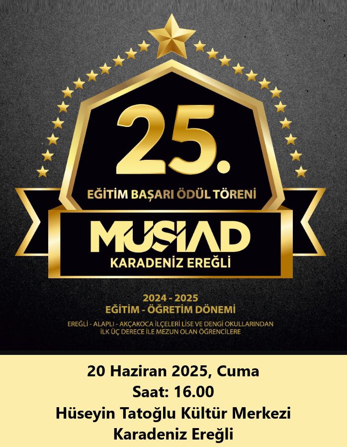 Müstakil Sanayici ve İş Adamları Derneği (MÜSİAD) Karadeniz Ereğli Şubesinin geleneksel hale getirmiş olduğu ve bu sene 25.’sini düzenleyeceği MÜSİAD Eğitim Başarı Ödül Töreni programı, 20 Haziran 2025 Cuma günü 16.00-18.30 saatleri arasında Hüseyin Tatoğlu Kültür Merkezinde gerçekleştirilecek.