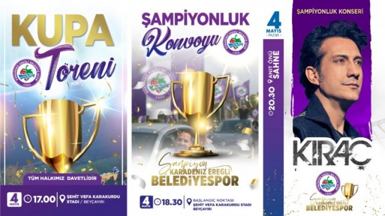 Kdz.Ereğli Belediyespor’un şampiyonluk kupasını 4 Mayıs Pazar günü Saat 15:00’de oynanacak Kdz.Ereğli Belediyespor – Gerede Spor maçı ardından Saat 17:00’de kupa töreni Beyçayır Şehit Vefa Karakurdu Stadı’nda gerçekleştirilecek. Binlerce Eflatun-Beyazlı taraftarın tribünleri doldurması beklenen törende futbolcular, teknik ekip, kulüp yönetimi ve Kdz. Ereğli halkı tarihi anı birlikte yaşayacak.