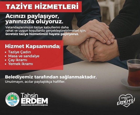 Hayatın en zor anlarında yalnız değilsiniz. Zonguldak Belediyesi olarak, kayıp yaşayan vatandaşlarımızın yanında olmak, yüklerini bir nebze olsun hafifletmek için Taziye Hizmetini başlatıyoruz.